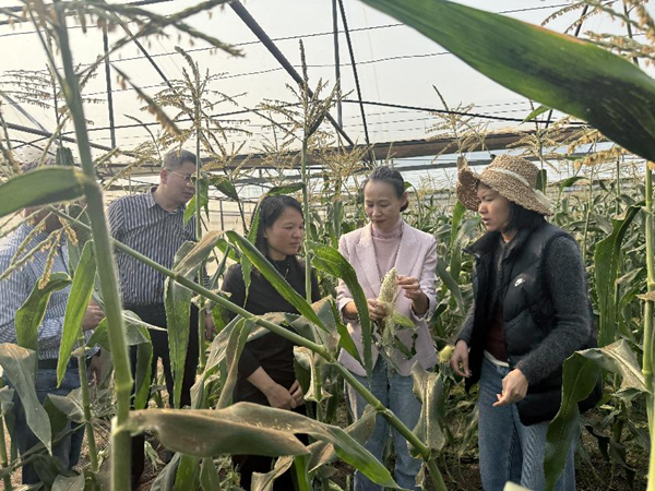 座谈结束后,左明一行前往分院科研试验示范基地,实地查看玉米、辣椒、西甜瓜、甘蔗、大豆、冬瓜、葡萄等作物试验种植情况,仔细察看作物长势、田间管理及新品种展示示范效果,详细了解分院相关科研项目实施进展、技术集成应用、示范推广成效等情况。