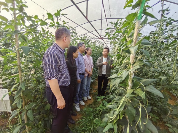 期间,左明一行前往银海区孙东村设施瓜菜生产基地调查春耕生产,对西瓜、丝瓜、豇豆、节瓜、辣椒等品种的试种情况进行了分类调研。左明与基地负责人亲切交谈,深入了解产业发展现状及面临的瓶颈问题,并针对品种优化、技术提升、市场拓展等关键问题提出了针对性的意见与建议。