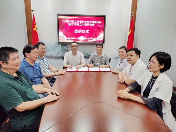 昇立中药研究所是南宁市民办非盈利中药研究机构,去年6月申请成为我院老科协的团体会员。根据此前双方意向和达成的共识,黄家雍代表院老科协与杨曼生所长共同签署了合作协议,并在该所举行了“广西老科技工作者协会区农科院分会专家工作站”揭牌仪式。今后,该研究所将根据需要聘请我院一批老专家,参与广西道地药用植物或食药同源作物的规范化栽培管理研究,探索并制定出高质量并绿色安全的中药材标准化生产栽培及产品生产流程技术和种植体系。为此,院老科协将与南宁市昇立中药研究所强强联手,发挥各自的人才和技术优势,重点做好广西本土珍稀药用植物资源的保护和开发利用,为发展广西大健康事业作出应有的贡献。