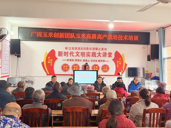 为进一步提升基层玉米生产水平,推动良种良法配套应用,增强公众对现代生物育种技术的科学认知,2月10日,玉米研究所所长时成俏研究员一行5人赴河池市环江县水源镇三美村开展玉米高产高质栽培技术及生物育种科普知识专题培训。河池市农业科学研究所、河池市农业技术推广站、环江县农业推广站、环江县种植大户及农户代表约80人参加了培训。