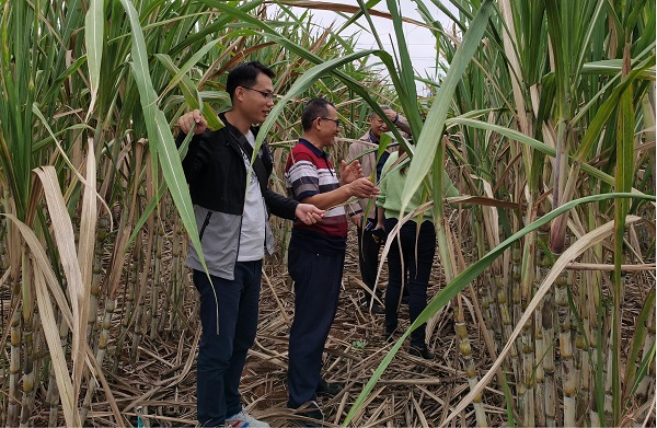 科技特派员在当地农技人员陪同下前往禄新镇甘蔗花生间作基地查看甘蔗、花生的长势情况。发现在前期受旱的影响下甘蔗估计会出现较大的减产,而花生预计亩产量与往年持平,花生地偶尔发现有茎腐病等病害发生。针对掌握的这些情况,科技特派员为农户讲解后期将如何科学管理甘蔗和花生以减少前期干旱和病害导致的损失。