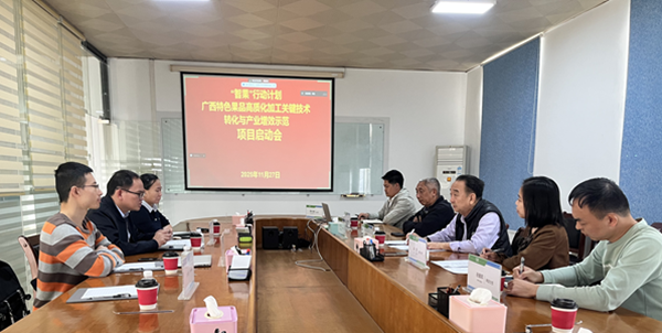 11月27日,由广西农业科学院牵头,合浦果香园食品有限公司、北京林业大学共同承担的“智果”行动计划“广西特色果品高质化加工关键技术转化与产业增效示范”项目启动会在北海召开,加工所李昌宝副所长主持会议,项目组科研骨干参加本次启动会。