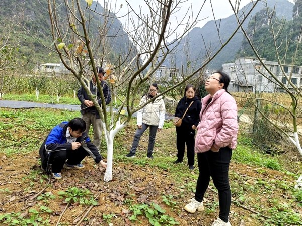 科技人员在靖西市武平乡果园、靖西大果山楂地理标志农产品保护工程核心生产基地,实地勘察了基地树干涂白、施肥、覆膜等农艺措施下的大果山楂树的生长性状,并对影响大果山楂产业发展的瓶颈问题——爆皮病进行采样,项目组成员将从基因组学、转录组学、代谢组学、微生物组学等多组学领域来攻克大果山楂产业壮大发展的瓶颈问题,来实现推动大果山楂产业可持续地发展。
