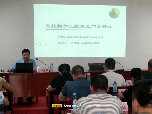 10月10-11日,广西热作所科技人员李建强、罗小杰到钦州市浦北县应邀参加由浦北县农业农村局主办的2025年自治区“送训下乡”——浦北县陈皮产业高质量发展培训班,并以题为《茶枝柑精深加工与产品研发》《陈皮加工技术与品质鉴别》分别进行授课。学员主要来自浦北县各乡镇农业服务中心技术员、村委驻村第一书记等60名。培训围绕浦北县陈皮特色产业加工及副产物综合利用内容开展,课堂上科技人员与学员互动交流,结合实际生产情况解答了学员们的疑问。
