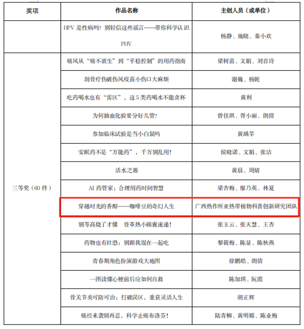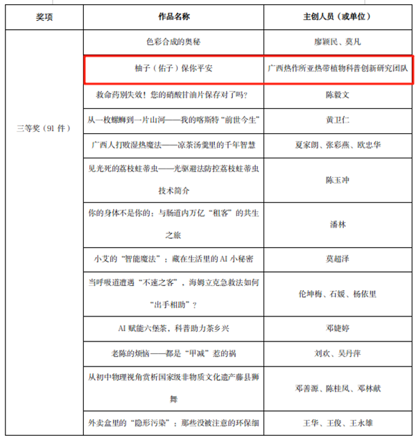 其中,《柚子(佑子)保你平安》荣获科普作品三等奖,该作品以柚子为切入点,融合客家文化传统、民间习俗及古籍记载等视角,巧妙地将植物学知识与文化传承相结合;另一件作品《穿越时光的香醇——咖啡豆的奇幻人生》荣获新媒体科普作品三等奖,该作品采用漫画的创新形式,以“大咖”的形象讲述了咖啡从种子到杯中的奇妙旅程。