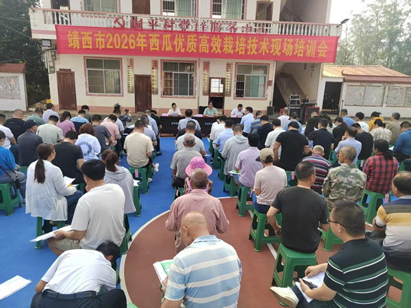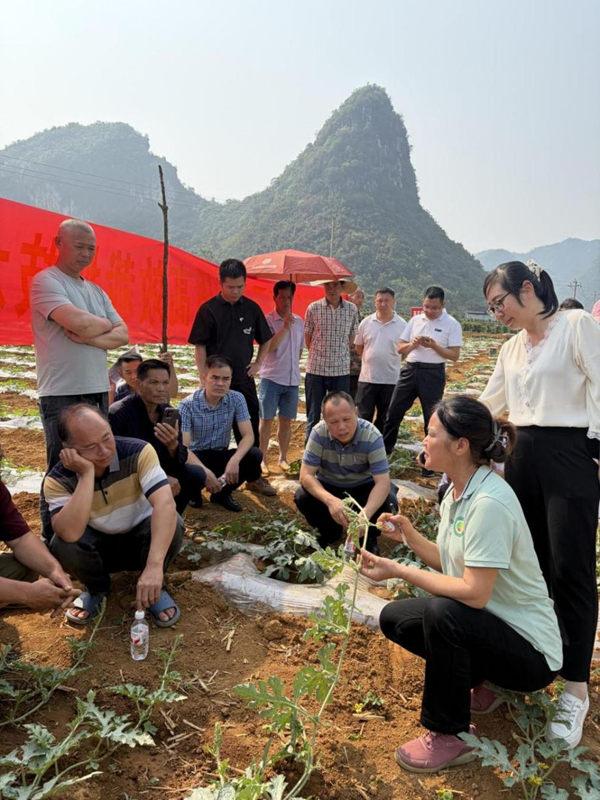 4月10日,园艺所西甜瓜团队科技人员何毅、叶云峰、张德梅在靖西市新甲乡峒平村开展西瓜优质高效栽培技术现场培训,旨在为靖西市新甲乡西瓜产业种植面积缩减、设施滞后、品种单一等突出问题提供技术指导。靖西市农业农村局和市果业发展中心分管领导、各乡镇农业服务中心负责人、新甲乡各村支书、新甲乡峒平村和念力村种植大户等共80多人参加了培训会。