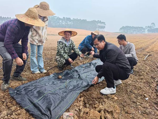 在寺村镇士篢村委易村屯新开辟的桑树种植基地,罗平俯身田间,手把手指导村民桑苗栽植技巧:“根系要舒展,覆土后轻提再压实,能提高成活率”“农家肥要深施,远离苗根,避免烧根”“地布要铺平盖齐,既保湿抑草,减少除草剂使用量对家蚕安全,又节省人工”。现场讲解细致生动,农户围拢聆听,互动积极。