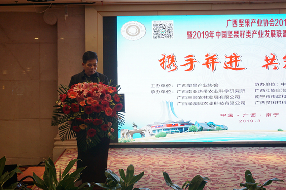 广西南亚热带农业科学研究所所长、广西坚果产业协会会长陈海生作协会2018年工作报告,总结了上一年取得的成绩,并提出今后的工作计划。他指出,在协会带动下,全区澳洲坚果种植面积从20.3万亩发展到27.5万亩,会长单位在全区贫困县、贫困村创建了36个科技示范培训基地,推动发展了11万亩脱贫产业,面向坚果企业转化了8项澳洲坚果科技成果,技术指导创建了首条年产5000吨坚果初加工生产线,并推动澳洲坚果产业发展首次纳入《广西区政府关于加快广西现代特色农业高质量发展指导意见》,表示今后将带领协会取得更大成绩。